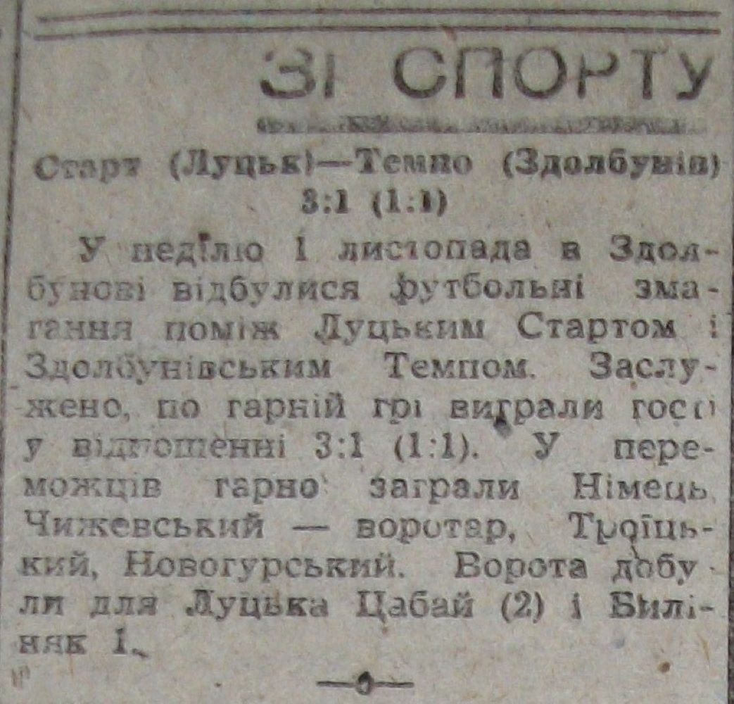 У 1942 році новостворена футбольна команда “Старт” брала участь у чемпіонаті Волині. Перший свій матч лучани провели вдома проти команди “Юнак” з Дубна. Господарі перемогли з рахунком 3:1. Цікавою була гра проти ковельської команди “Просвіта”. Луцькі гравці мали прибути на матч о 12 годині, проте значно спізнилися і деякі футболісти команди противника покинули поле. Господарі вимушені були шукати гравців серед вболівальників. Після того, як під час матчу в одного з ковельських футболістів розлетівся черевик – азарт до гри й тим паче виграшу зник. Вочевидь завдяки цьому луцький “Старт” здобув перемогу з рахунком 5:0.