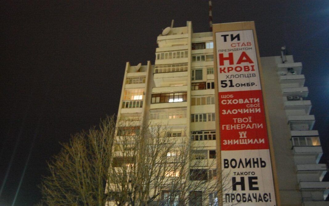 Вчора ввечері на стіні 16-поверхового будинку в центрі Луцька повісили банер довжиною більше 30 метрів, на якому великими буквами в біло-червоно-чорних тонах було зазначено: «Ти став президентом на крові хлопців 51 ОМБР. Щоб приховати свої злочини, твої генерали її знищили. Волинь такого не прощає!». Вочевидь, звернення було адресоване Президенту України Петру Порошенку, який сьогодні приїздить на Волинь.